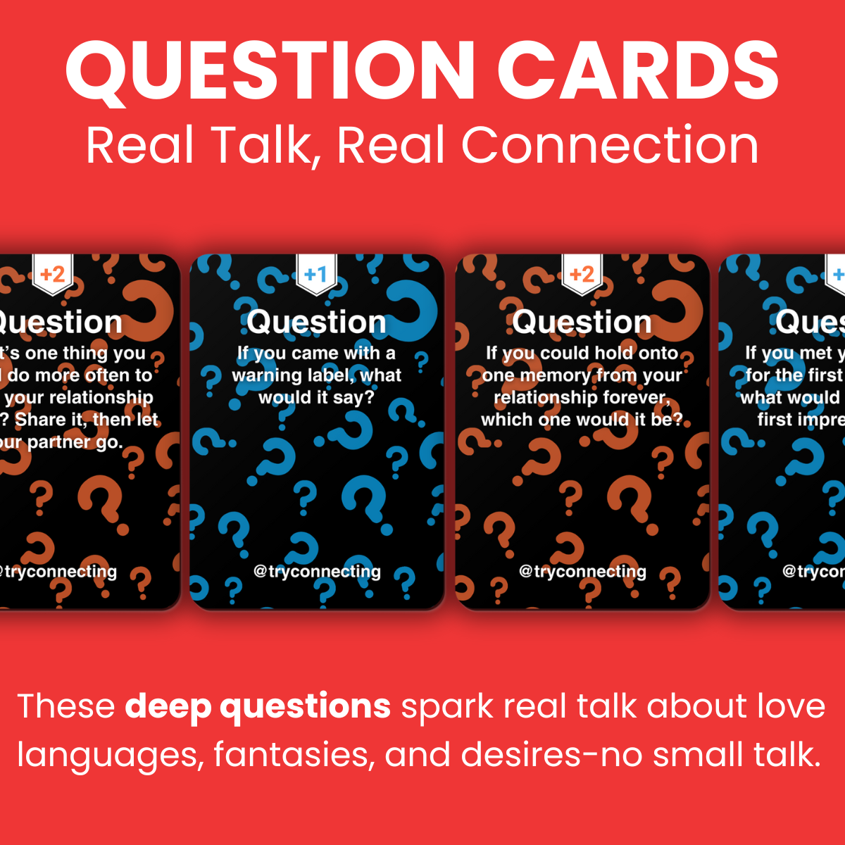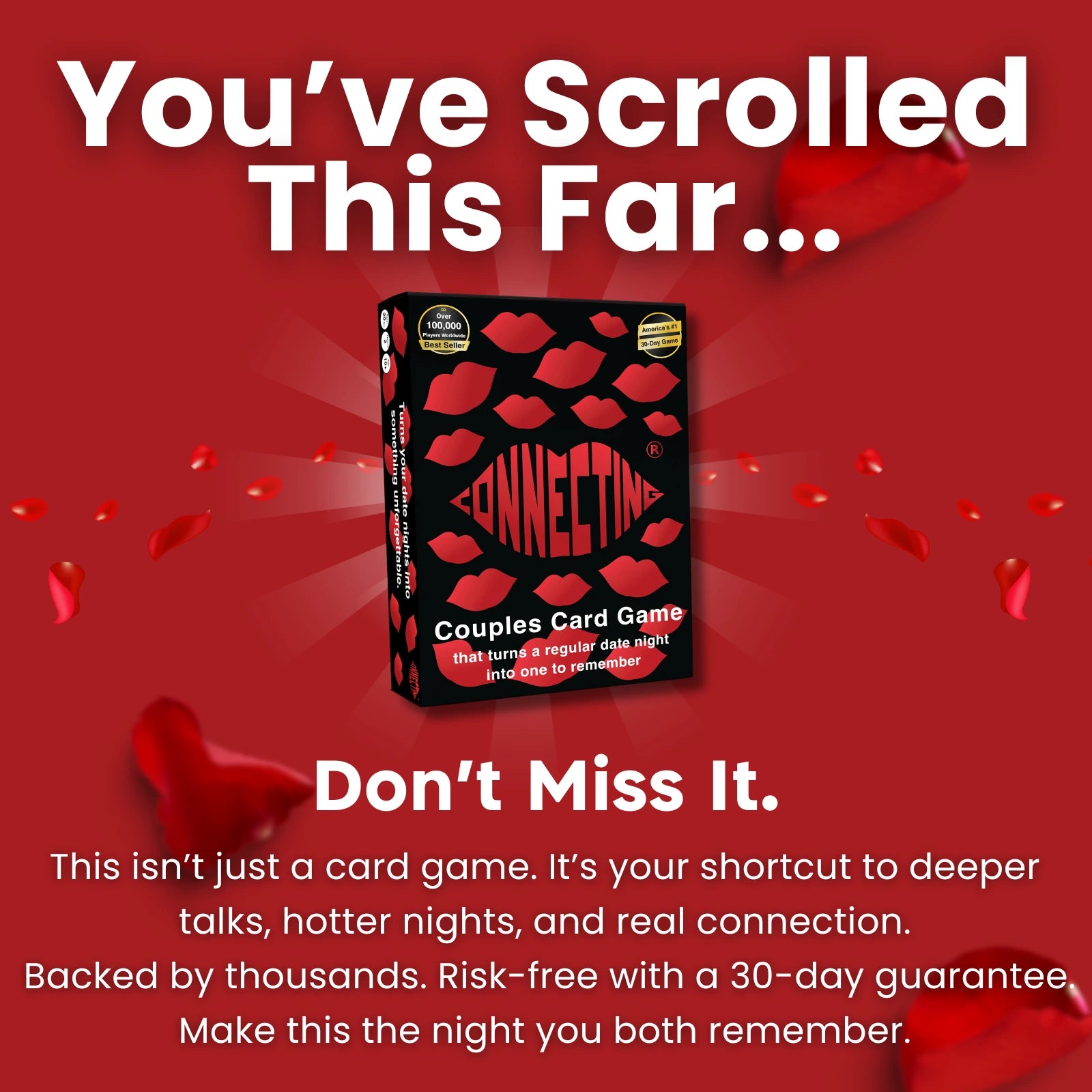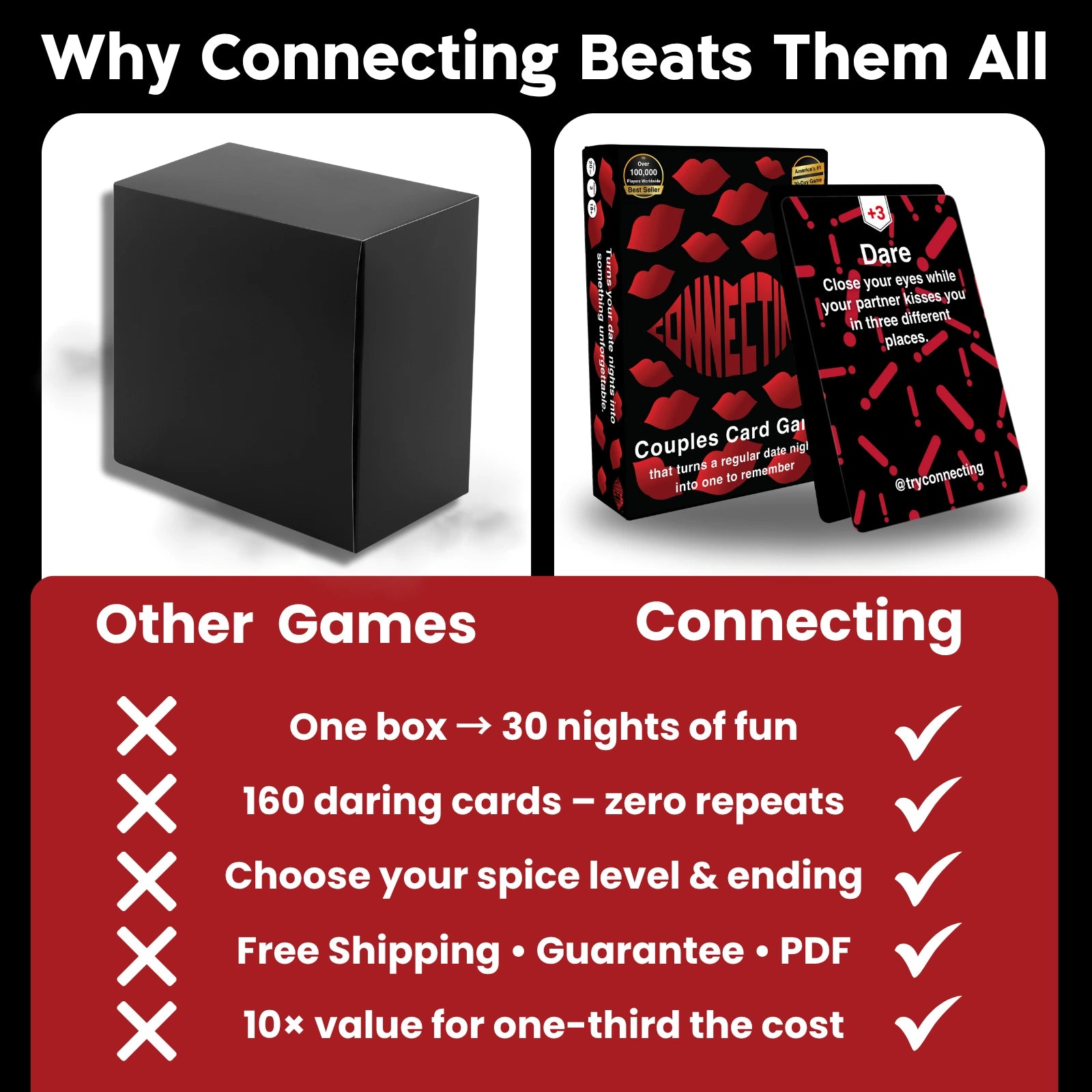 We built Connecting⢠to bring couples closer. If it doesnât make you laugh, flirt, or feel the spark again within 30 days, reach out to us for a fast, hassle-free return and full refund.